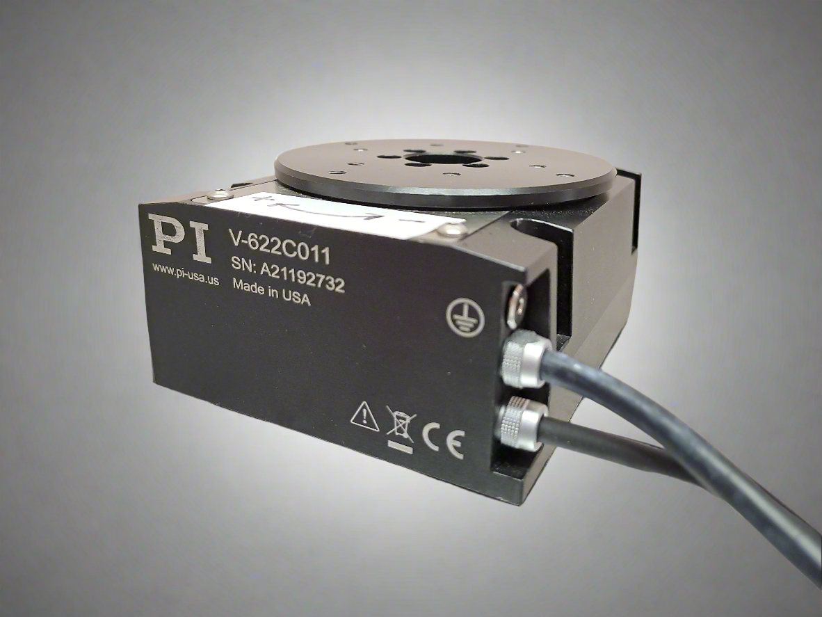 The V-622 is a high-performance rotary stage equipped with frictionless electromagnetic torque motors and precision ball bearings. The V-62x family comes with table diameters from 85 to 200 mm and features a clear aperture ranging from 15 to 105 mm. Maximum angular velocity is 20 revolutions per second or 7200 deg/sec. They were built for applications in the optics and photonics, sample inspection, metrology, semiconductor testing and inspection, industrial automation, measuring technology, precision micro-assembly, and biotechnology sectors.